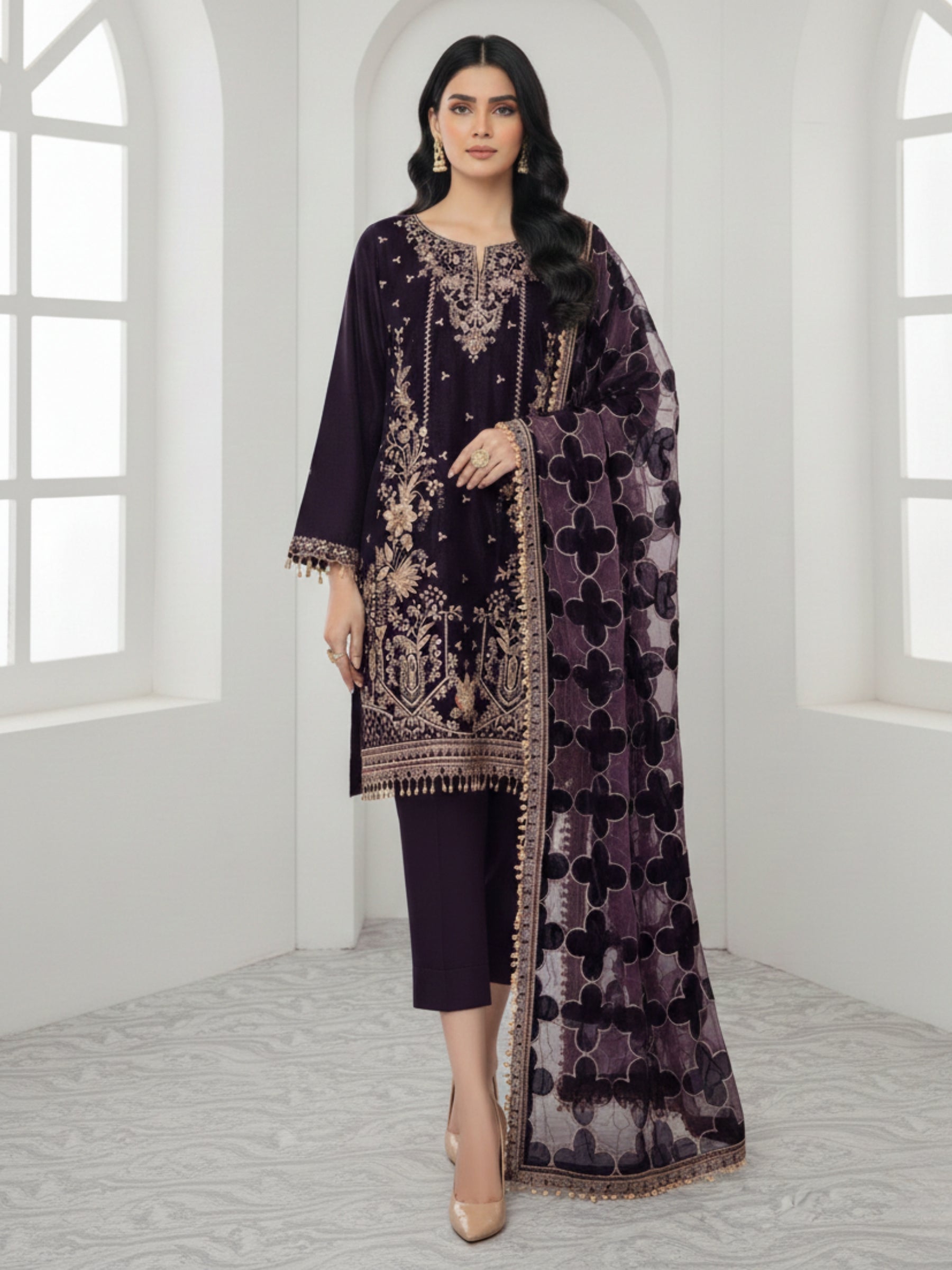 Color: Plum Fabric Details: Shirt: Embroidred Velvet with heavy adda work Dupatta: Velvet with net appliqué detailing Trouser: Velvet