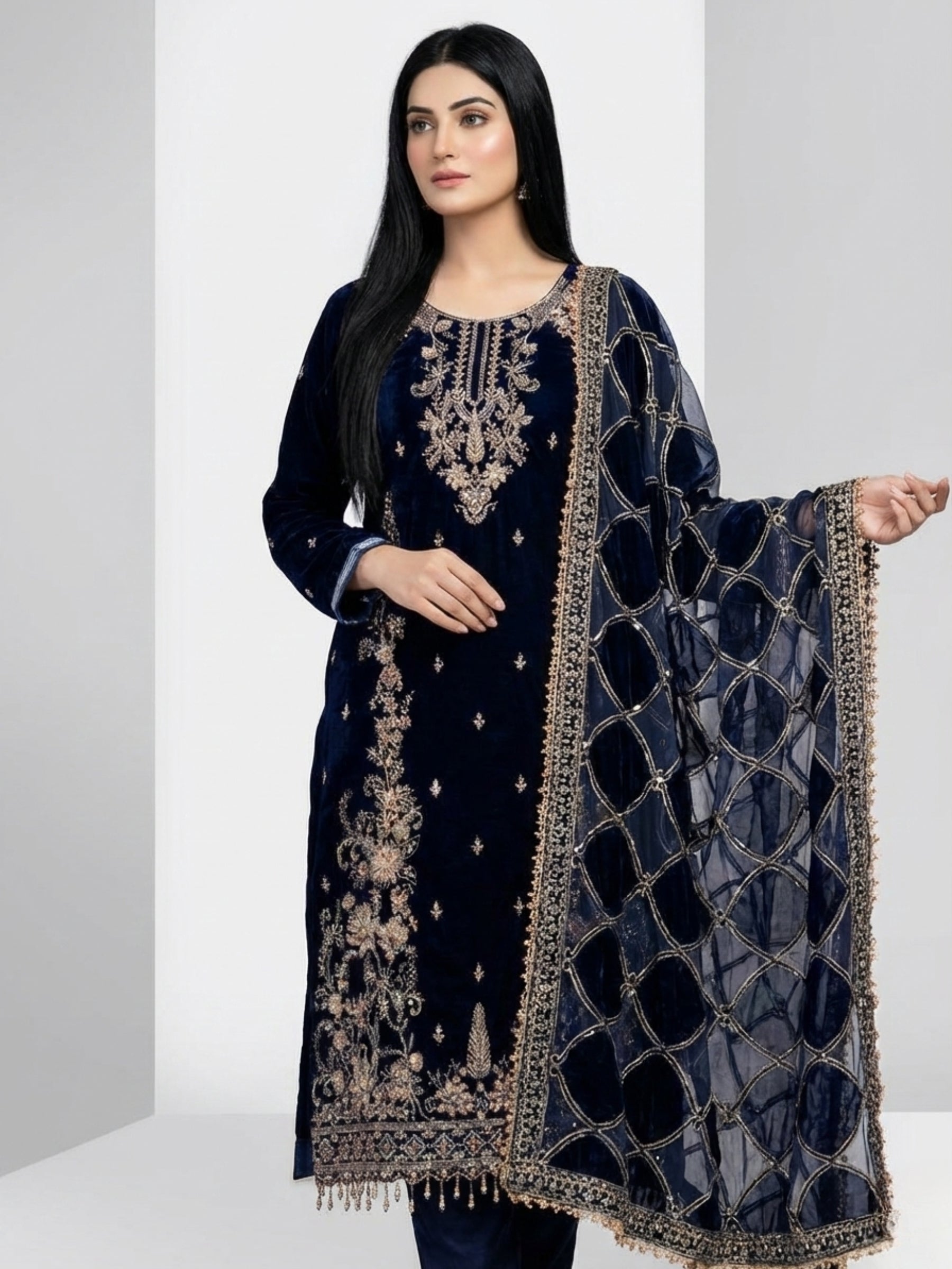 Color: Cobalt Blue Fabric Details: Shirt: Embroidred Velvet with heavy adda work Dupatta: Velvet with net appliqué Trouser: Velvet