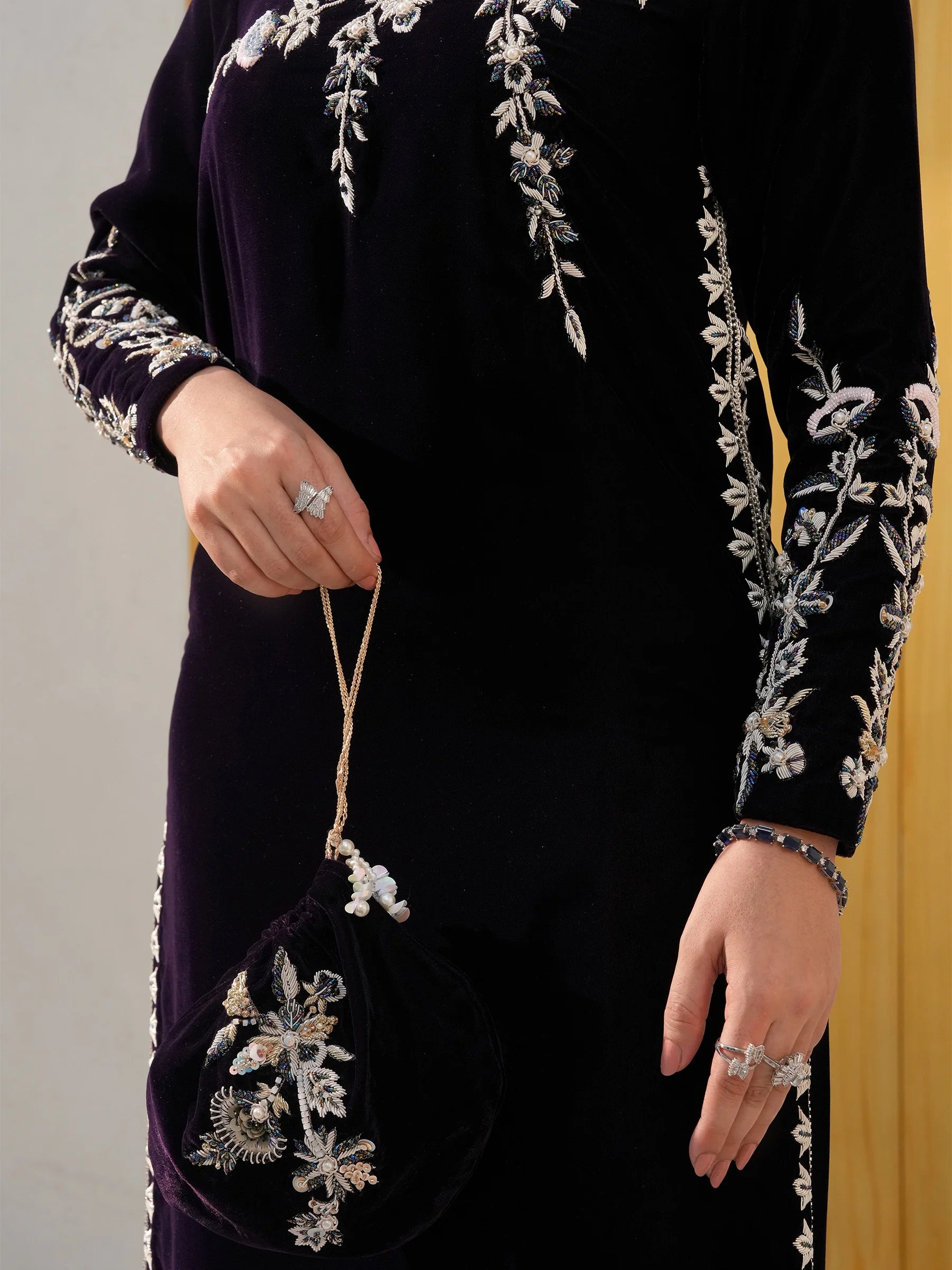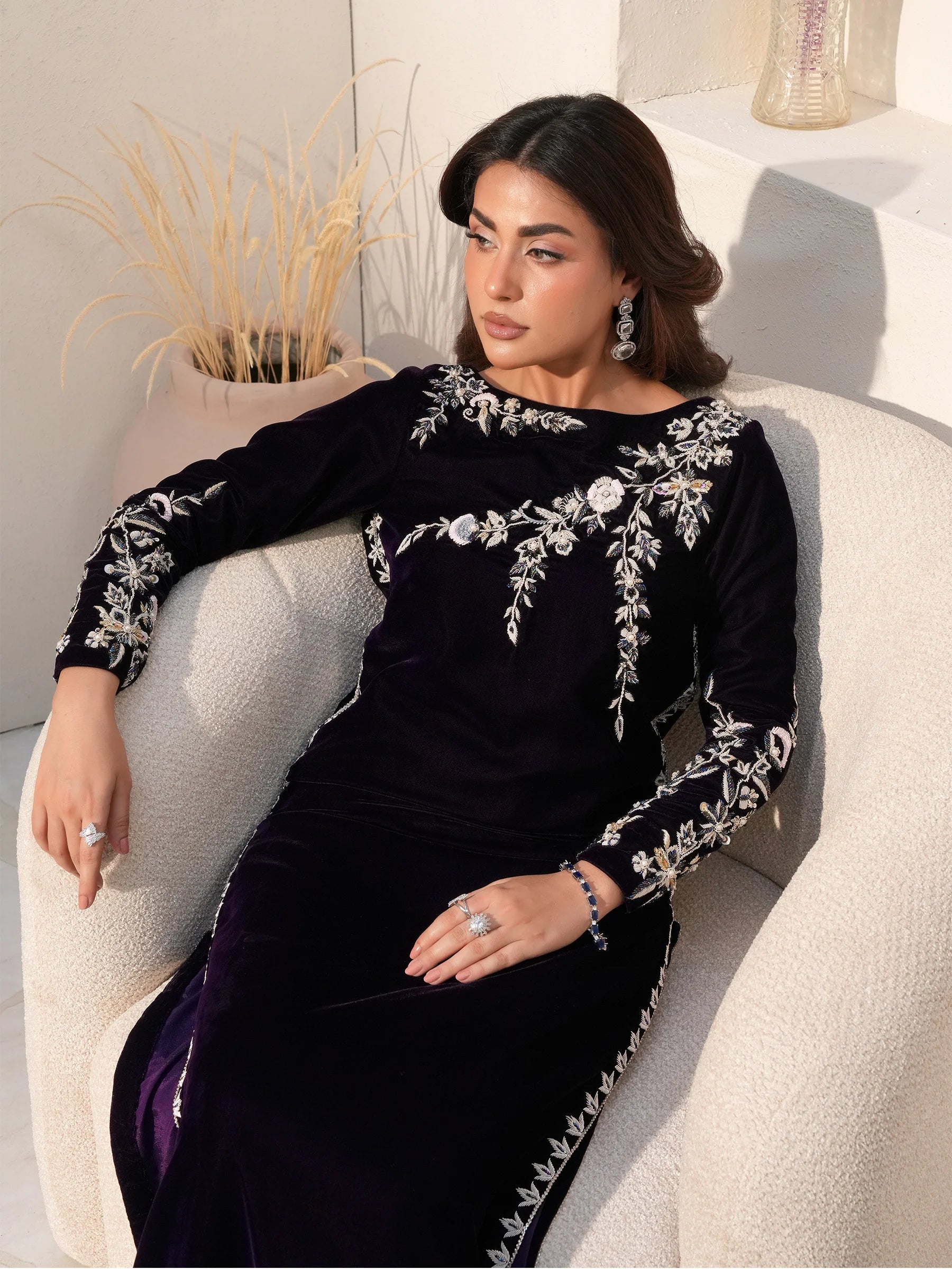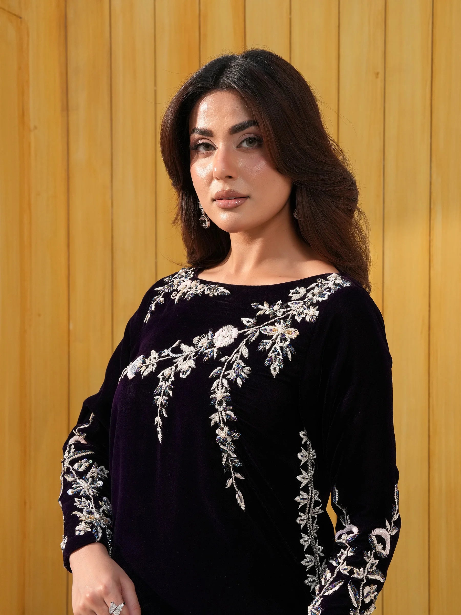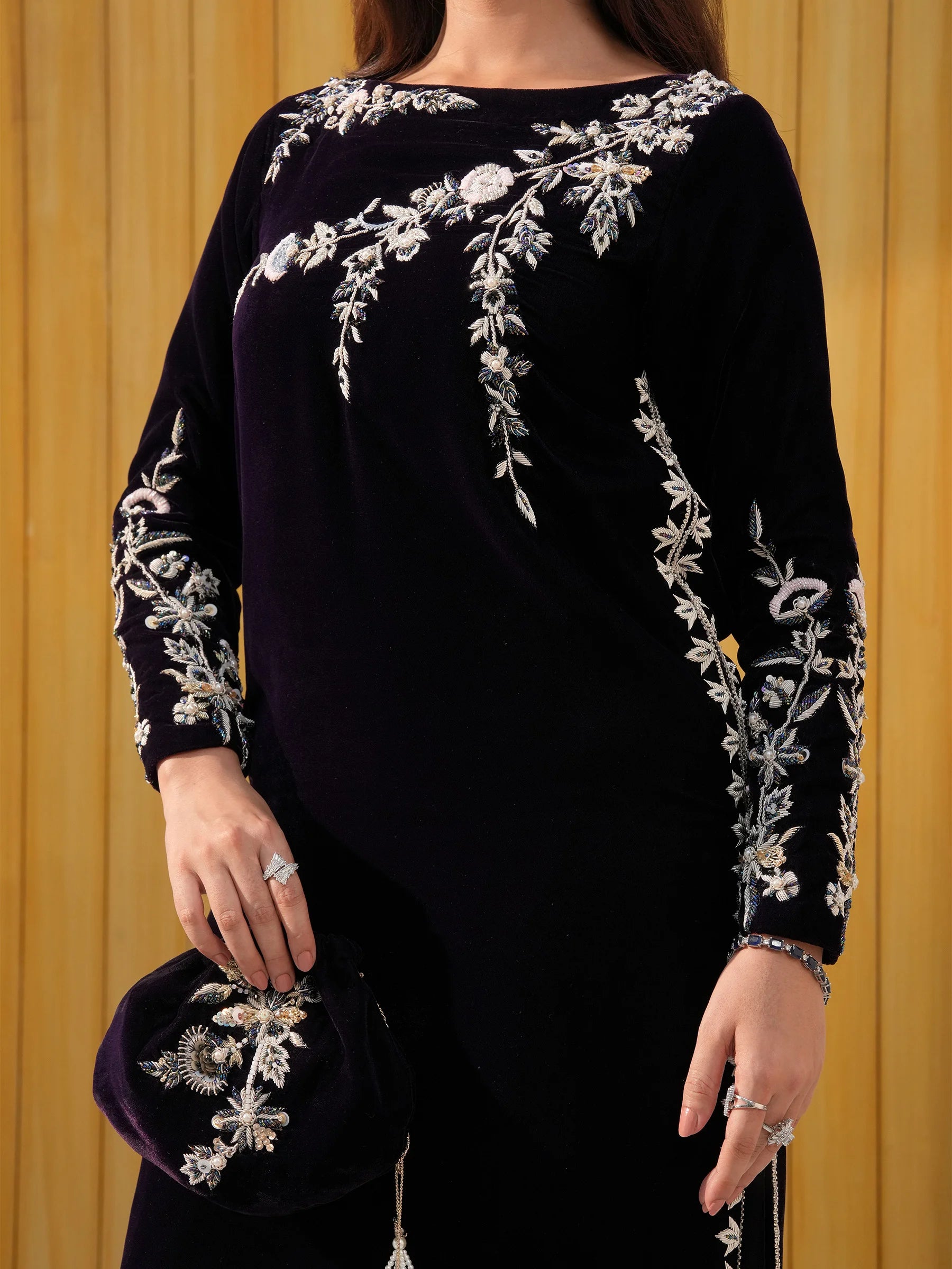 Captivating charm meets timeless craftsmanship. The shirt, rendered in rich velvet, is adorned with intricate adda work on the front, back, and sleeves — a statement of elegance and artistry. Paired with a straight velvet pent, the ensemble exudes sophistication and balance, creating a look that is both regal and effortlessly graceful.
