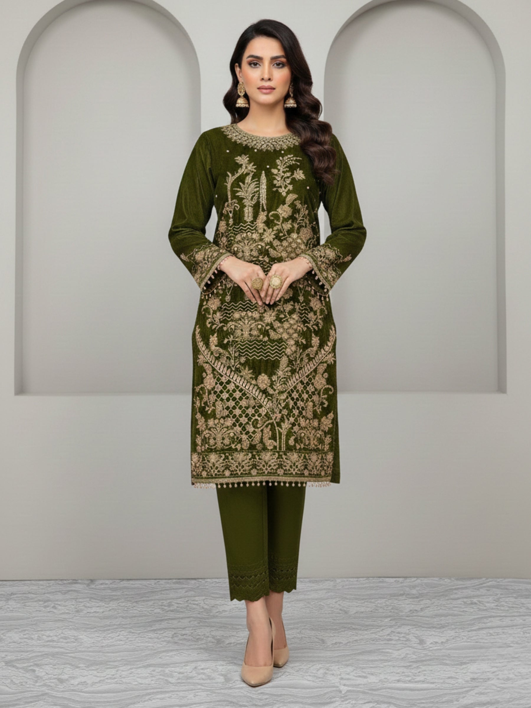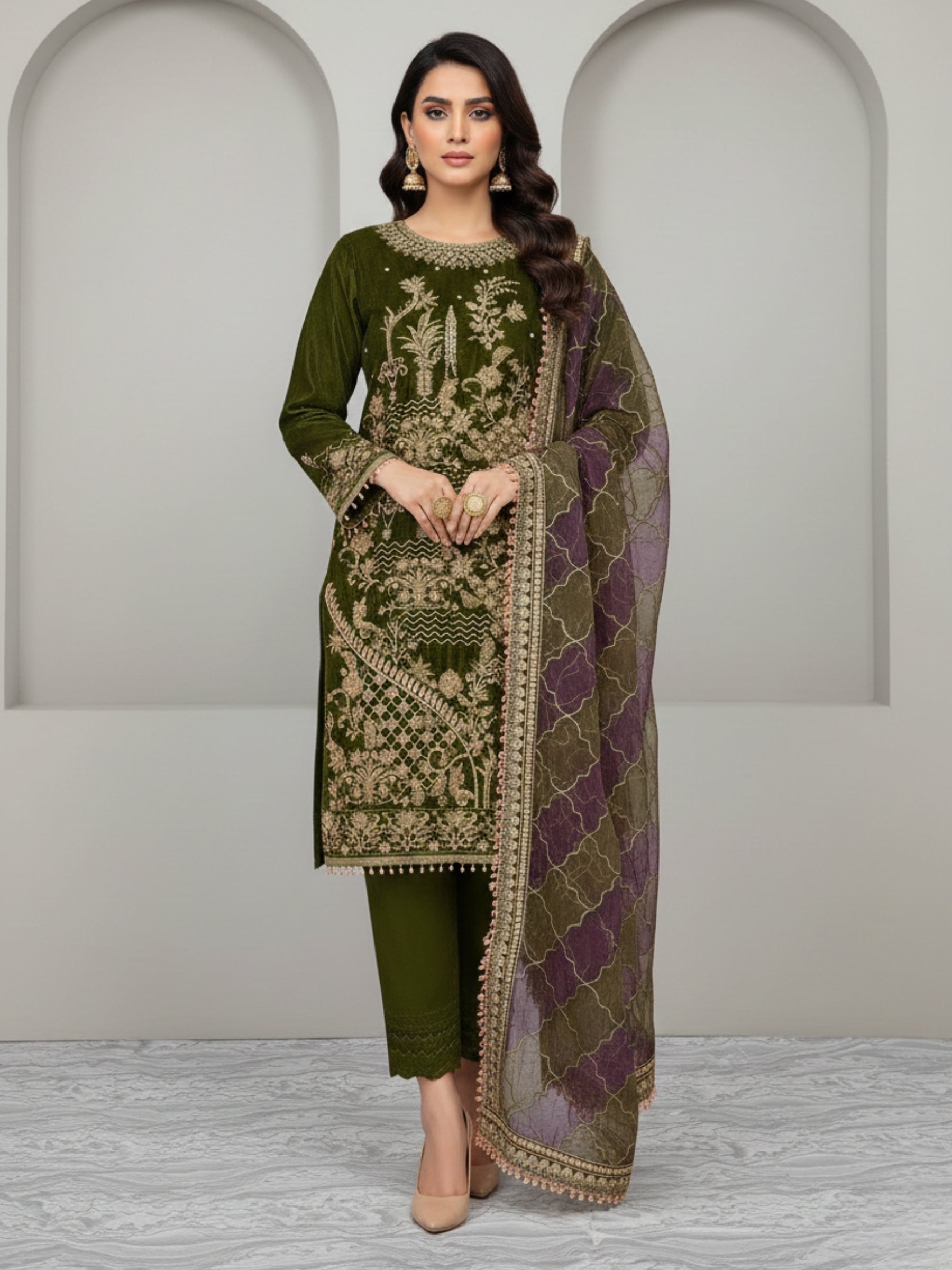 Step into timeless elegance with this regal olive green ensemble, exquisitely adorned with intricate embroidery and heavy adda work on the front, back, sleeves, and dupatta. Crafted from luxurious PHOENIX 9000 velvet, the shirt showcases detailed embellishments that add remarkable richness, depth, and grandeur. The look is completed with a tailored velvet trouser, offering a sleek and sophisticated silhouette that exudes grace—ideal for festive celebrations and formal occasions.