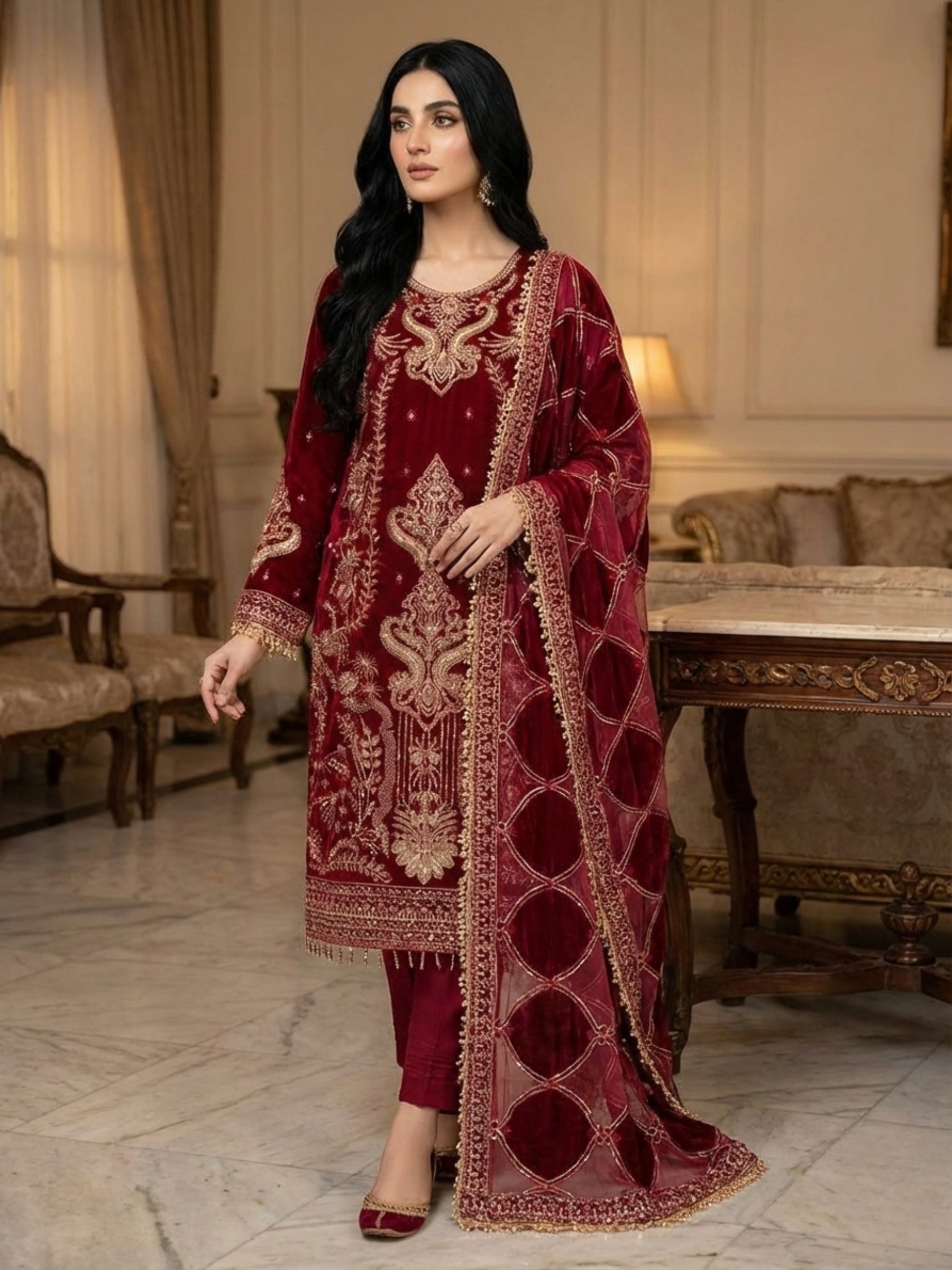 Color: Deep Red Fabric Details: Shirt: Embroidred Velvet with heavy adda work Dupatta: Velvet with net appliqué detailing Trouser: Velvet