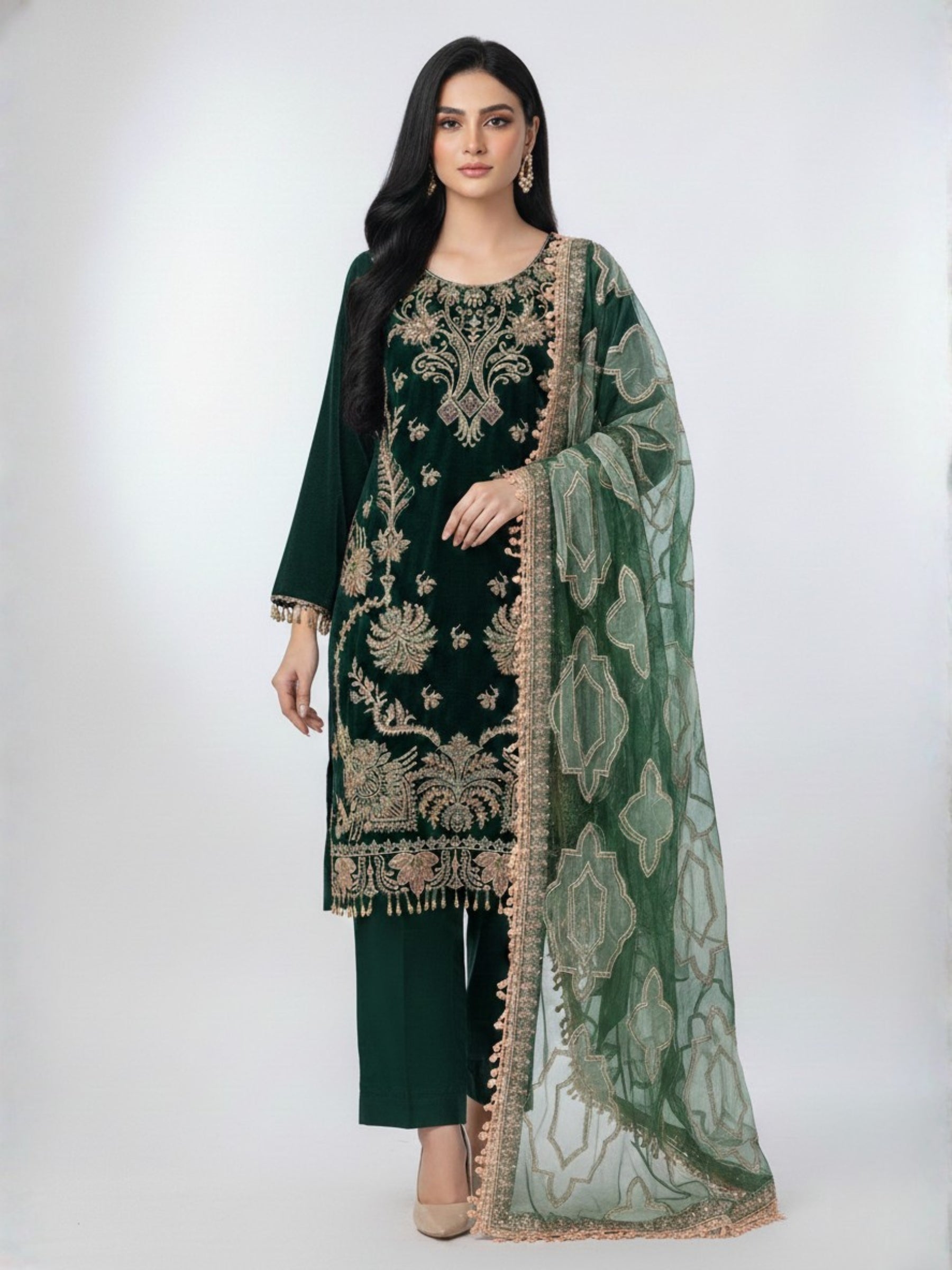 Color: Emerald Green Fabric Details: Shirt: Embroidred Velvet with heavy adda work Dupatta: Net Trouser: Velvet