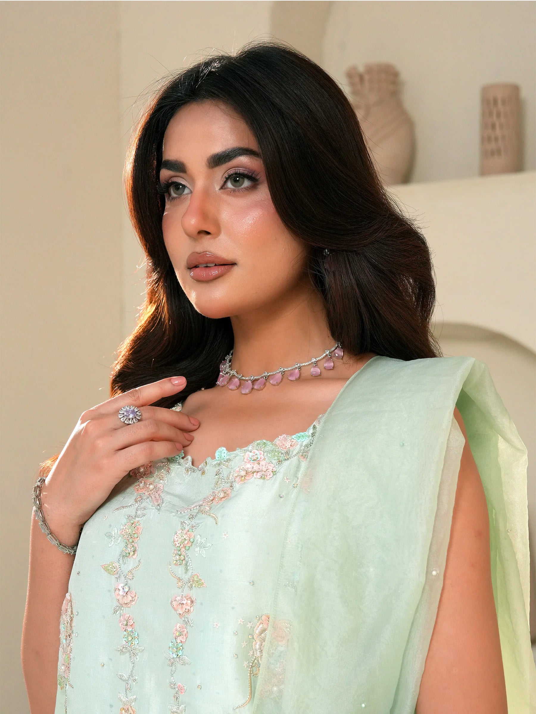 Radiant elegance flows through this ensemble. The shirt, crafted in raw silk, features embroidered and adda work detailing on the front, while the back remains plain for a refined balance. Elegant adda work with imported crystal material enhances its luxurious charm. Paired with an organza spray dupatta that adds a delicate shimmer, the look is completed with a chiffon sharara, offering graceful movement and timeless sophistication.